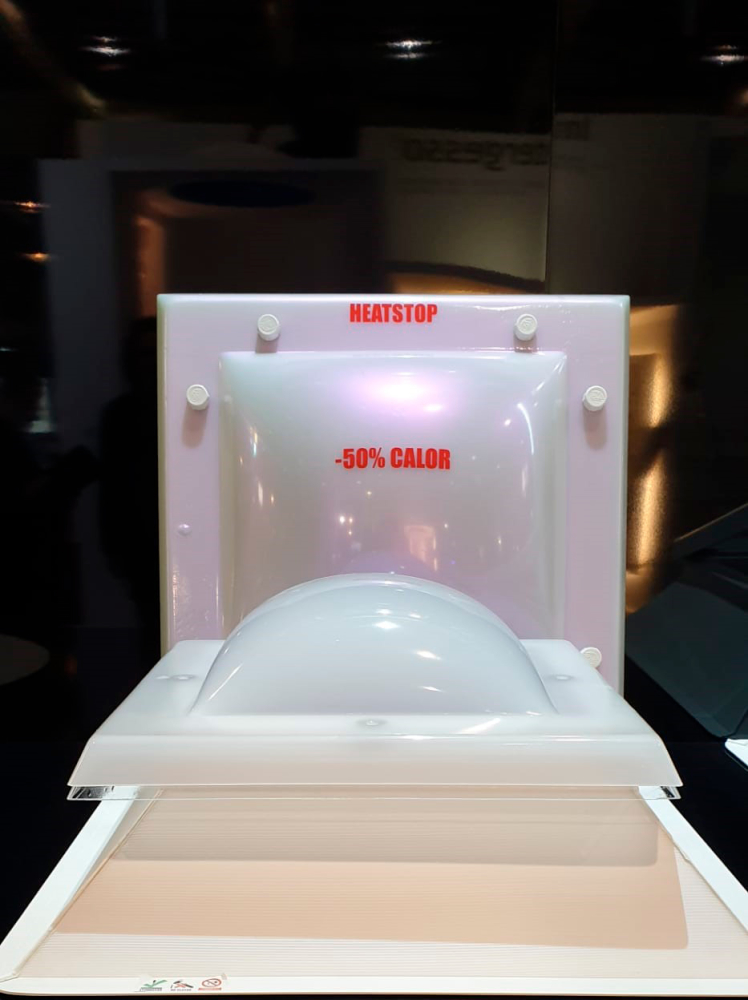 O efeito HEATSTOP consegue-se pela reflecção de uma terceira parte da radiação térmica solar que permite obter um efeito especial anti-calor, mantendo a mesma luminosidade. Este modelo aplicado com cúpula dupla permite obter menos 50% de calor comparativamente a uma cúpula normal.