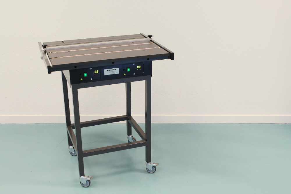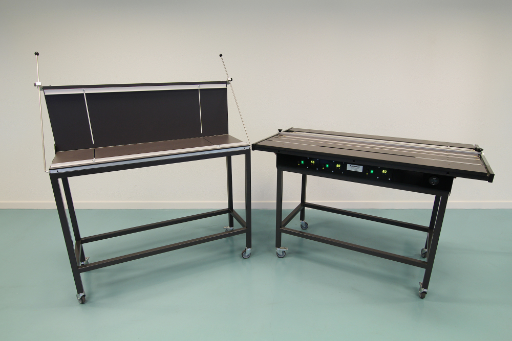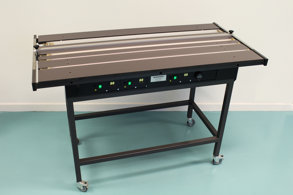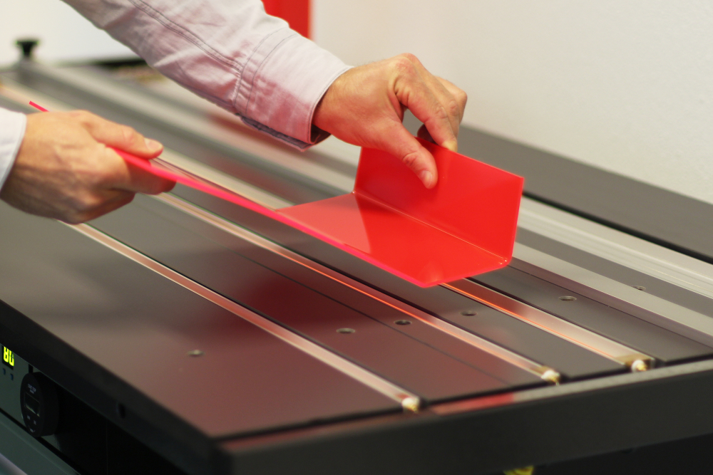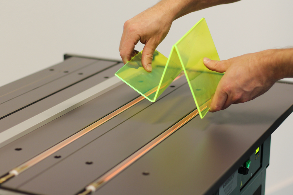 Máquina de dobrar plásticos profissional, construída com perfis e fios de aquecimento facilmente ajustáveis. A temperatura do fio de aquecimento é contínua e pode ser controlada com um controlador EV (para um fio de aquecimento) ou DB (para dois fios de aquecimento).