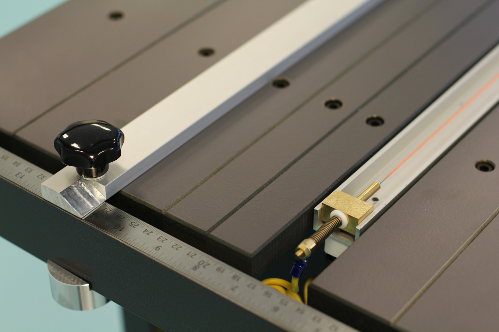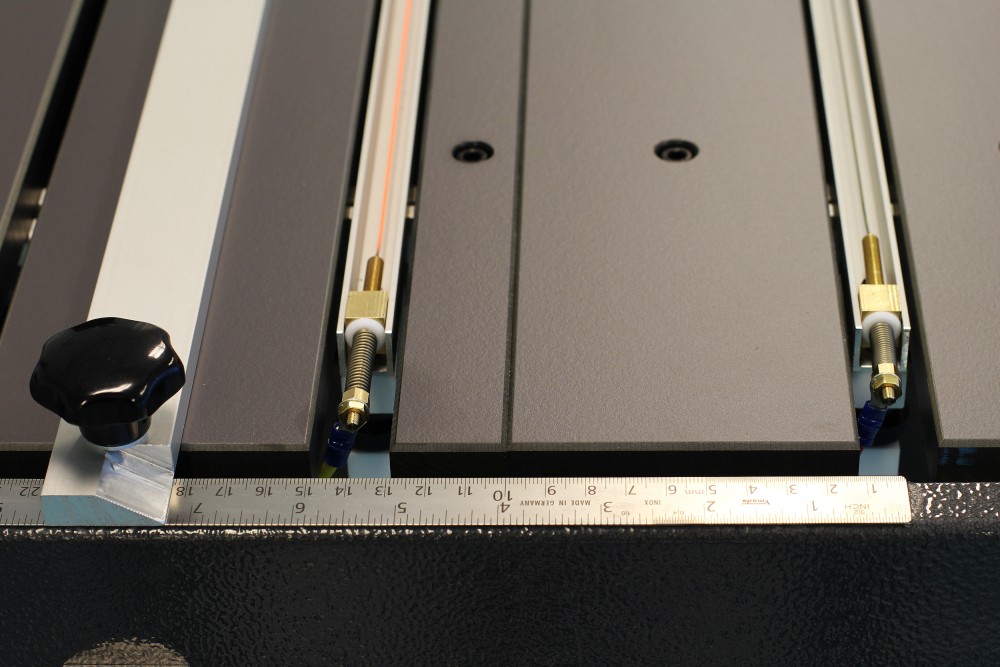 Os batentes estão marcados com escala em milímetros. A máquina é modular e está preparada para ser expandida com perfis extra e/ou controladores de temperatura. Também dispomos de perfis para múltiplos fios de aquecimento em caso de necessidade de dobrar grandes espessuras ou para maiores raios de curvatura.