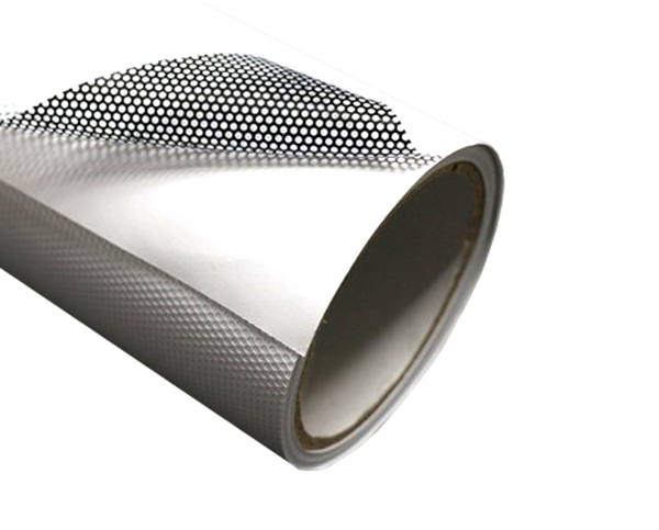 Película micro-perfurada auto-adesiva branca com traseira preta, para aplicar em superfícies planas e transparentes como o vidro, acrílico, policarbonato, etc.