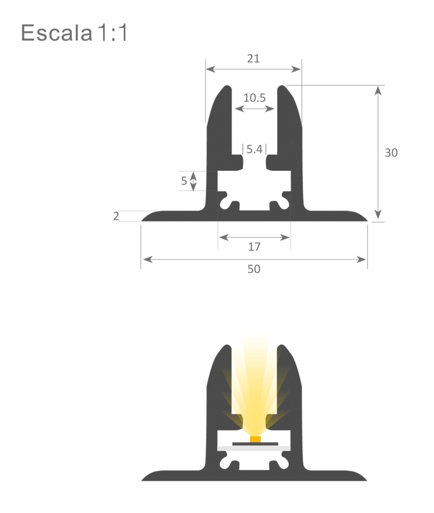 Perfil de luz filtrante anodizado prata.
