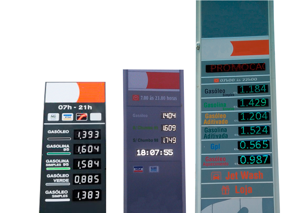 Indicadores de preços a LED para postos de abastecimento de combustíveis que se adaptam aos pórticos existentes e usam LEDS de alto brilho e grande ângulo de visão. Possuem comando à distância por infravermelhos e poderão ter, a pedido, comunicação sem fios, ligação Ethernet, GPRS/GSM.